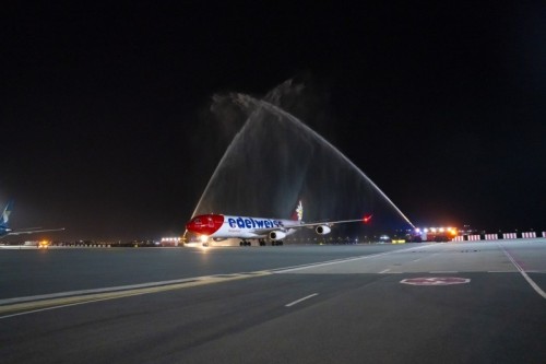 Muscat International Airport welcomes the first flight of Swiss Edelweiss Airline on the direct route between Muscat International Airport and Zurich International Airport with two weekly flight Tuesday and Friday. The flight was greeted with conventional water spray salute amongst a welcome of senior employees from Oman Airports.